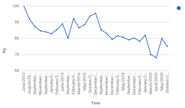 P.s. ég læt hérna fylgja með mynd sem sýnir þróunina á þyngdinni minni í gegnum árin, mér finnst þetta vera góð sönnum fyrir því hvað góð rútína getur gert fyrir mann. Í dag þarf ég meira að spá í fituprósentu en þyngd, en það er gaman að eiga þetta til að sjá hvað maður getur gert ef maður viðheldur plani og lætur það ekki hafa áhrif á sig til lengri tíma þegar að maður dettur af hestinum. Það er bara að vippa sér aftur upp á bak.